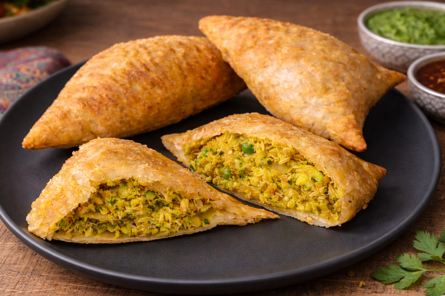 Filling: Onions, Water, Texturized Wheat Protein, Canola Oil, Pea Protein Isolate, Chili Powder, Garlic, Lemon Juice, Cilantro, Salt, Ginger Paste, Cumin, Coriander, Garam Masala, Turmeric, Black Pepper.